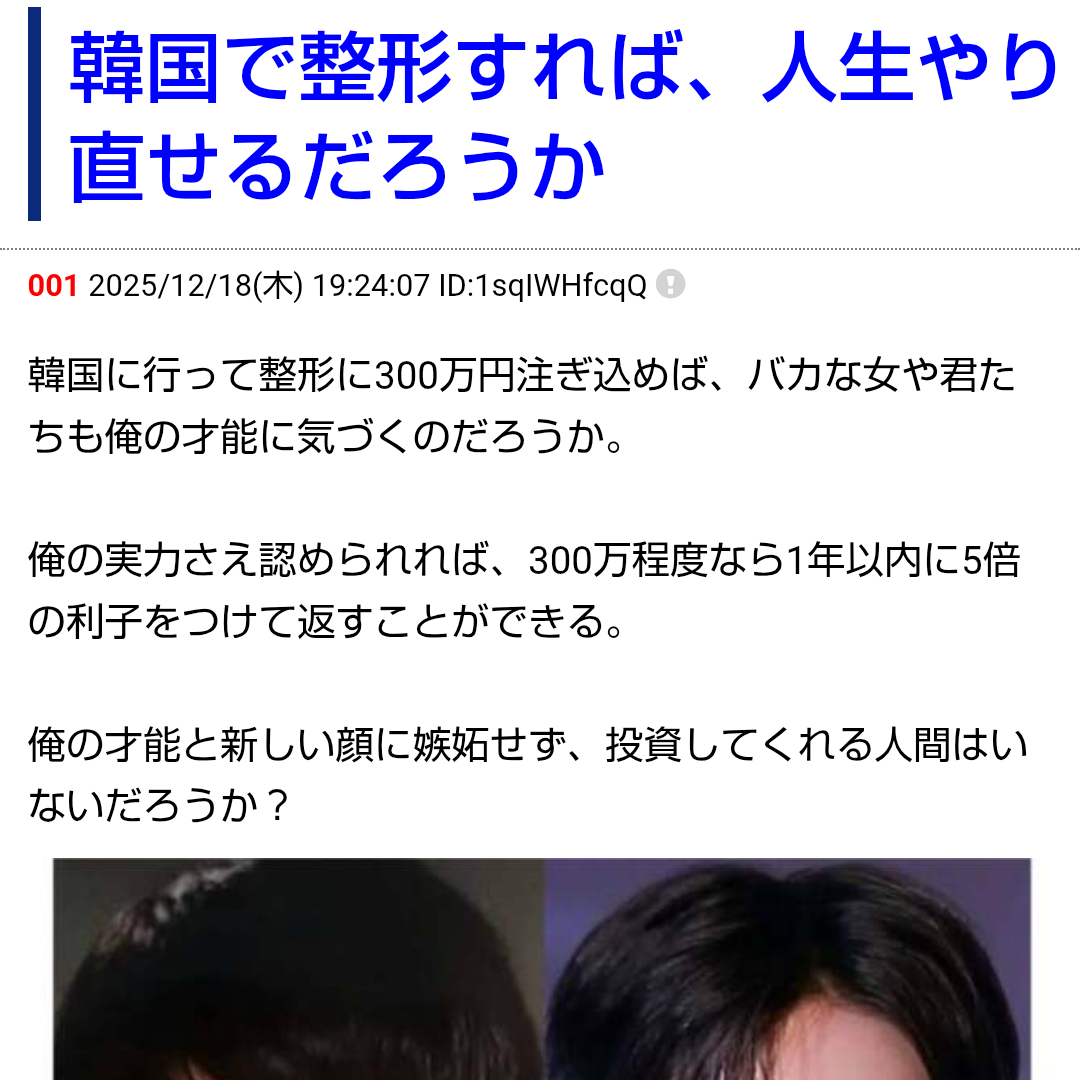 | 008 | 某コテハンさん | 2025/12/19(金) 06:06:01 | 来てたぞこれw | 画像なし |
