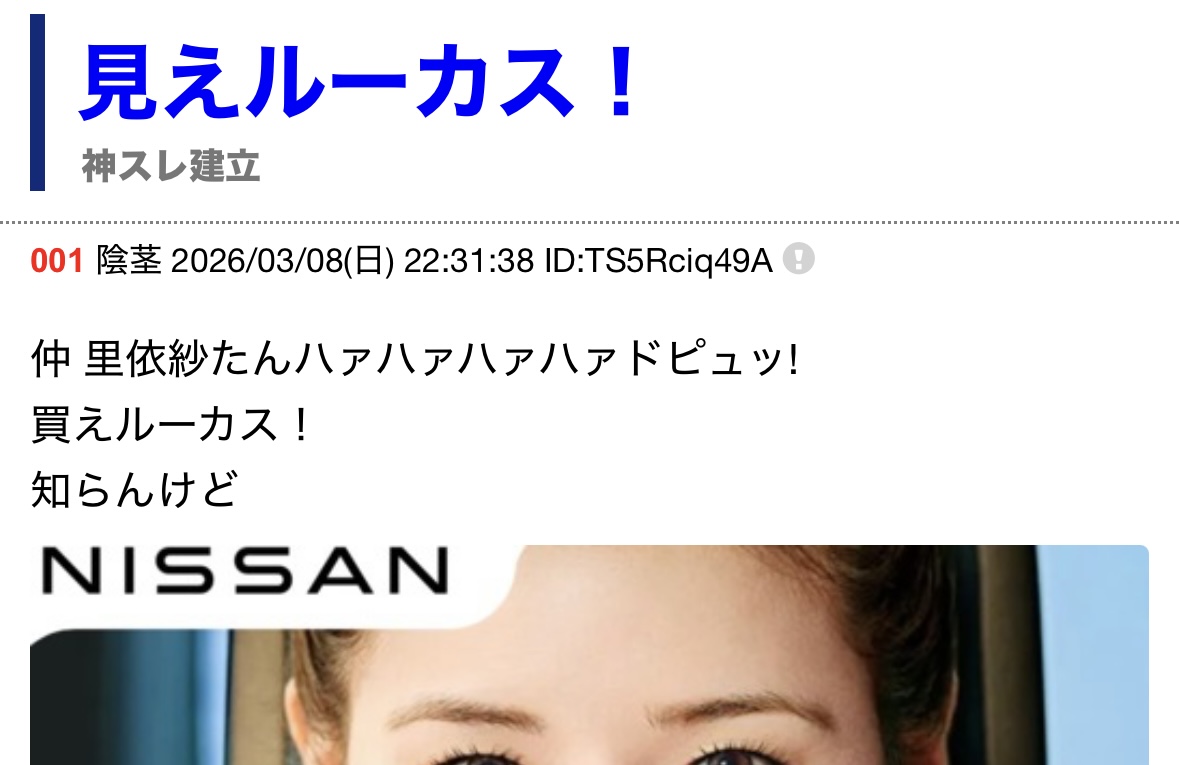 | 002 | 某コテハンさん | 2026/03/15(日) 21:06:30 | 空上げ名無し暗躍なりすまし陰茎豚満月のス | 画像 |