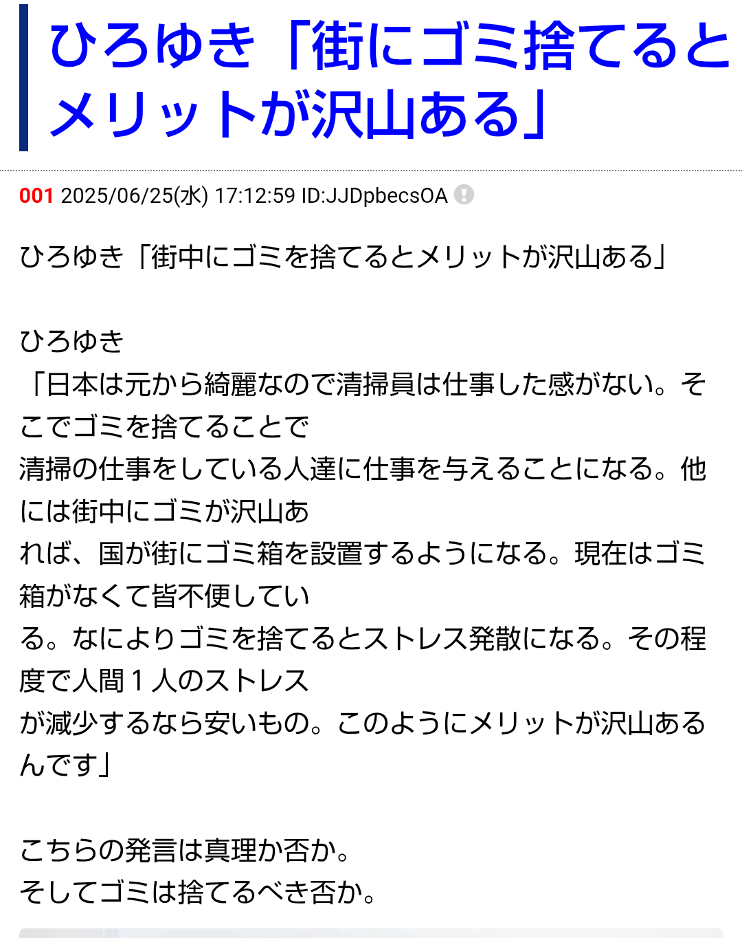 | 008 | 名無しさん | 2026/03/27(金) 19:54:13 | ゴミ箱増やしても、きっとそれ以上にゴミが | 画像なし |