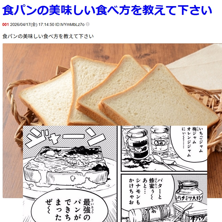 | 001 | 名無しさん | 2026/04/17(金) 17:14:50 | 食パンの美味しい食べ方を教えて下さい | 画像 |