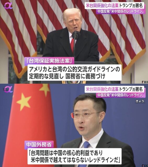トランプ大統領は、米国と台湾の公的な交流に関するガイドラインの定期的な見直しを国務省に義務づける「台湾保証実施法案」に署名。