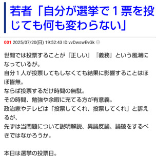 スレッドタイトル:若者「自分が選挙で1票を投じても何も変わらない」