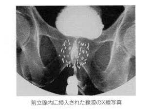 この画像は、前立腺がんの治療において放射線源を体内に埋め込む「小線源治療」のレントゲン写真です。