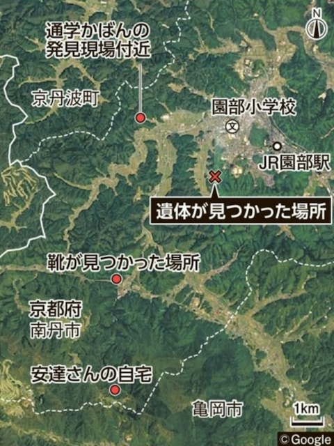 一番は遺体の場所。なんでこんなに小学校から近いところへ?リュックや靴は遠いところなのに。